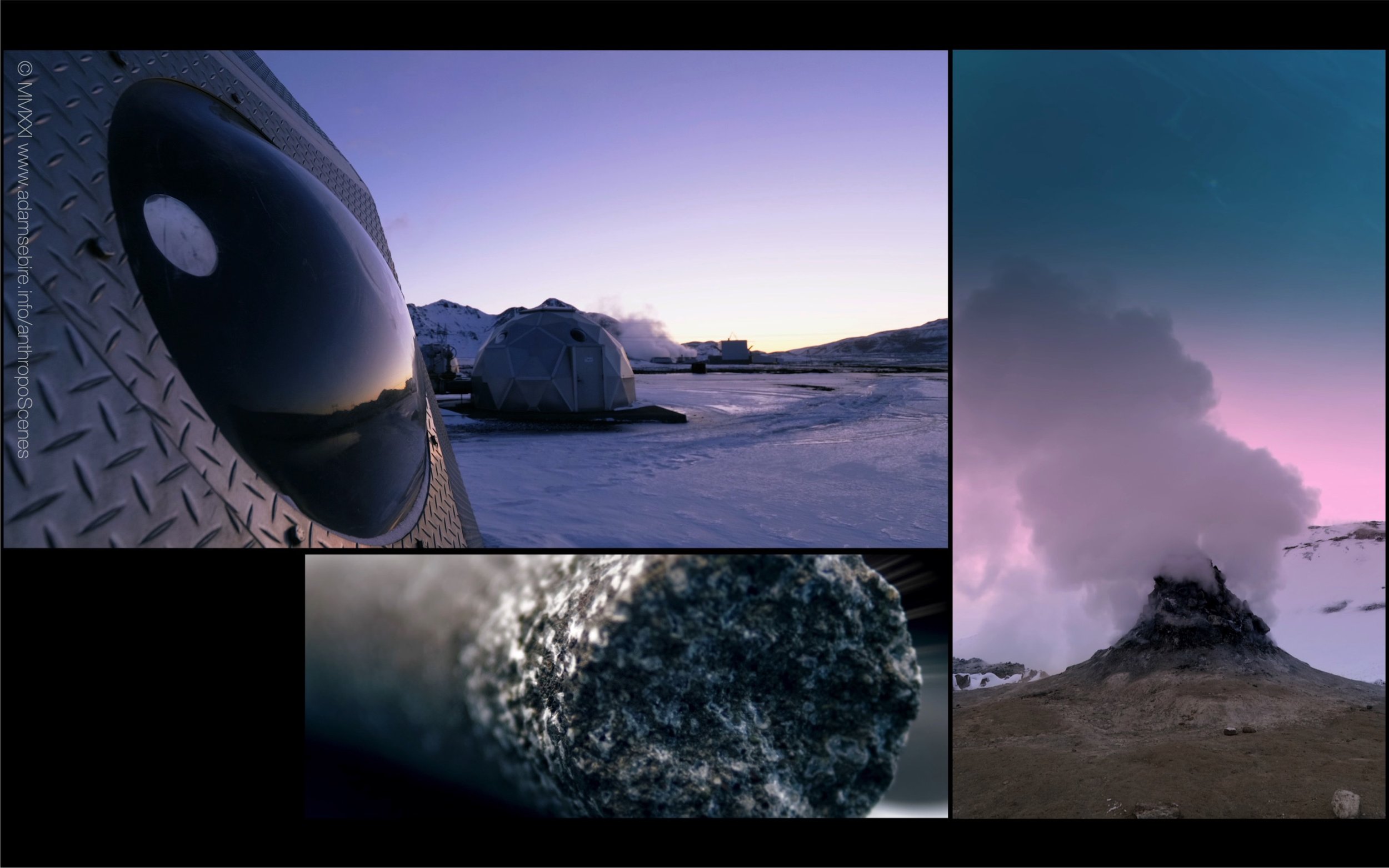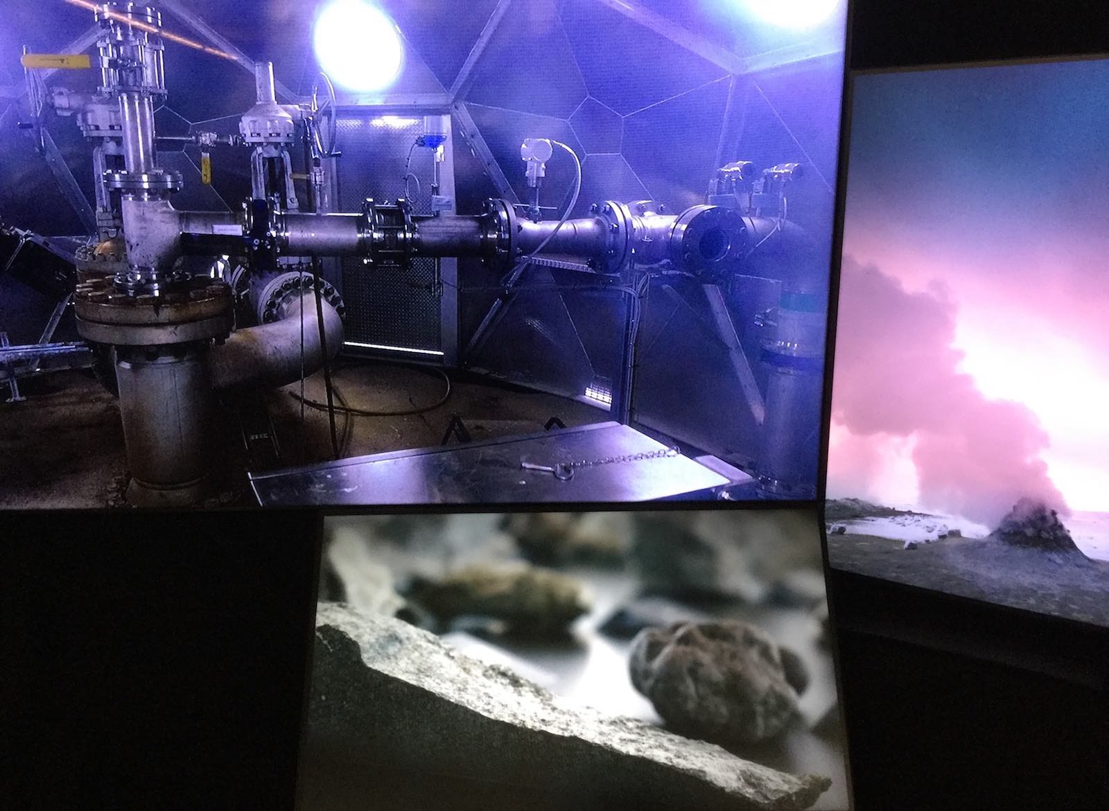 In the video triptych, one of the three screens investigates the experiments at Hellishei∂i (the injection wells of CarbFix plus Climeworks’ white cube “carbon scrubber” DAC module, a prototype for what’s expected to be many thousands spread across the planet). In another, a core sample of the sequestered CO₂ — now mineralised as calcite within the basalt host rock — appears as a quasi-mystical object in a vitrine (in an exhibition this screen can be replaced by a real core sample). The third screen is more ambiguous: set in a future geological era where complex lifeforms seem to have disappeared, and where the planet is correcting an atmospheric imbalance. Now, geological processes reverse. After only a few hundred thousand years, homeostasis — equilibrium — will have returned.