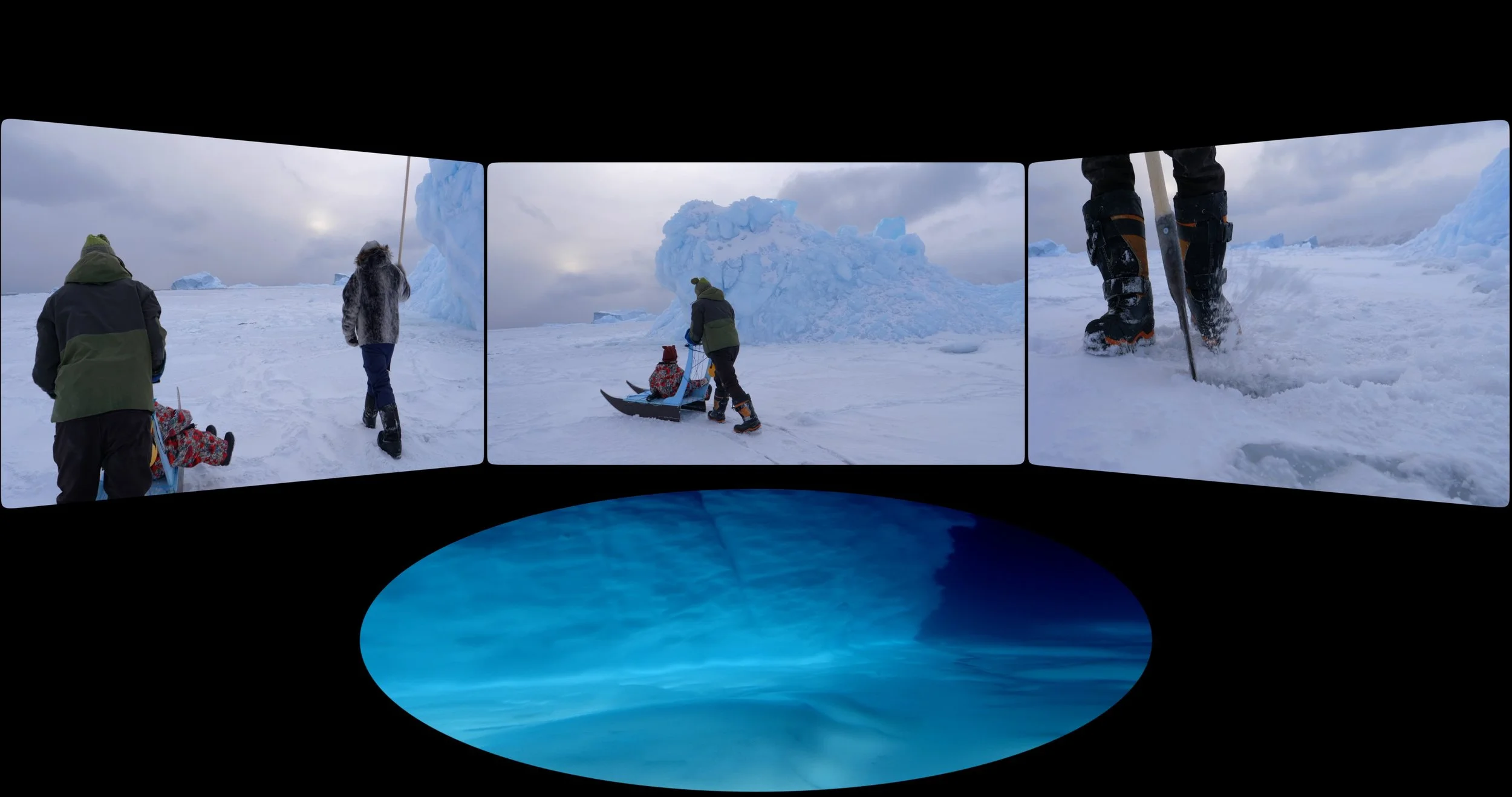 Uummannaq Island is a small indigenous Inuit settlement placed well above the Arctic Circle in Kalaallit Nunaat (Greenland) at 70.7º North. This four-channel work was filmed during the 3-month polar night when the sun remains resolutely below the horizon till February. It's a season when outsiders vanish and locals get down to business on sea frozen solid. At least that’s what used to happen; under the influence of climate change the Earth’s poles are warming 2-4 times more rapidly than the rest of our planet.