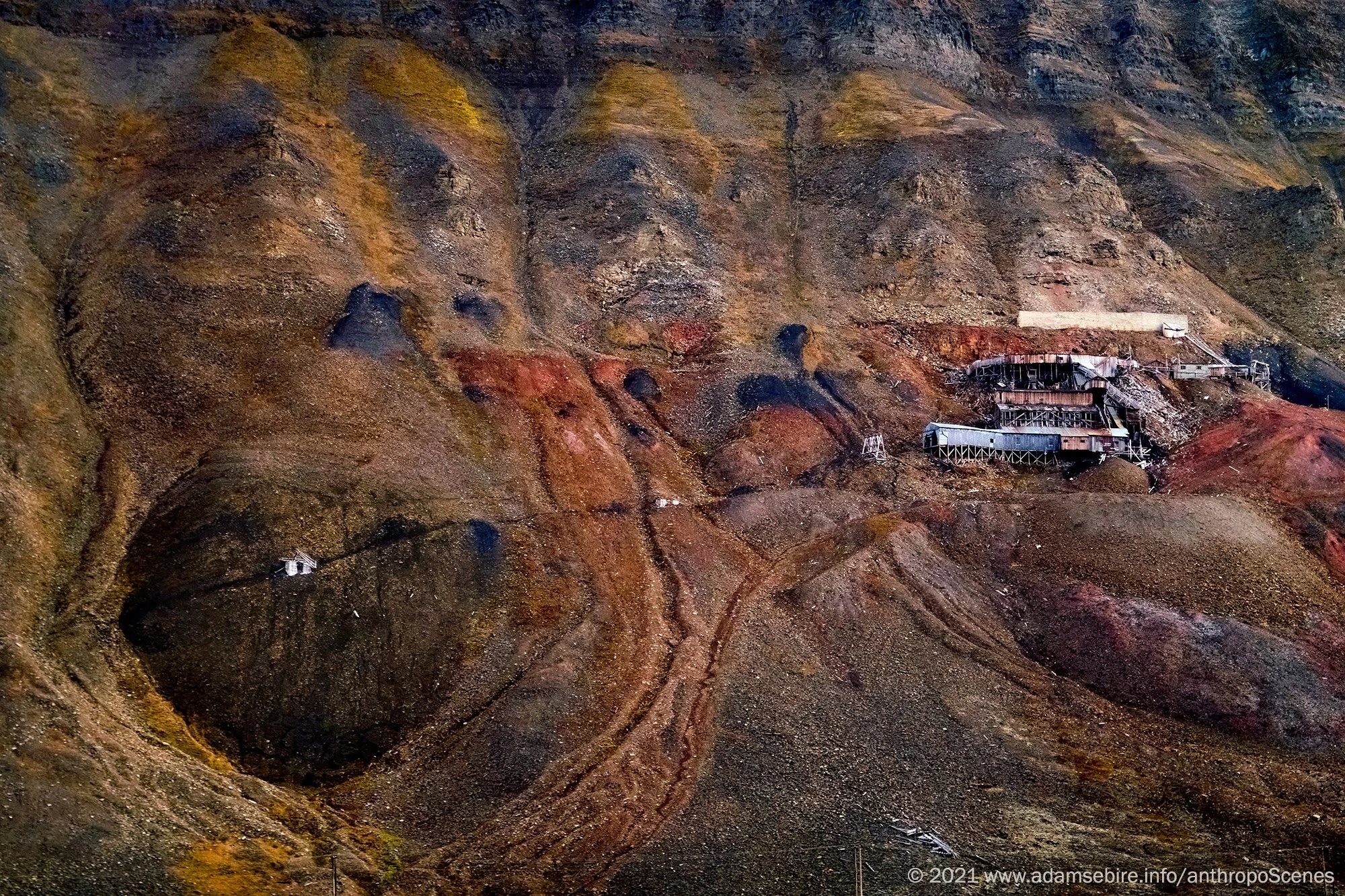 Only 1,300km from the North Pole, Svalbard’s abandoned 'Santa Claus' Mine (Gruve 2B) spills mineral spoil down former glacial valleys. As snow and ice retreat, traces of coal fallen from the collapsed aerial cableway reveal an eyelid: a slumbering creature on the verge of awakening.