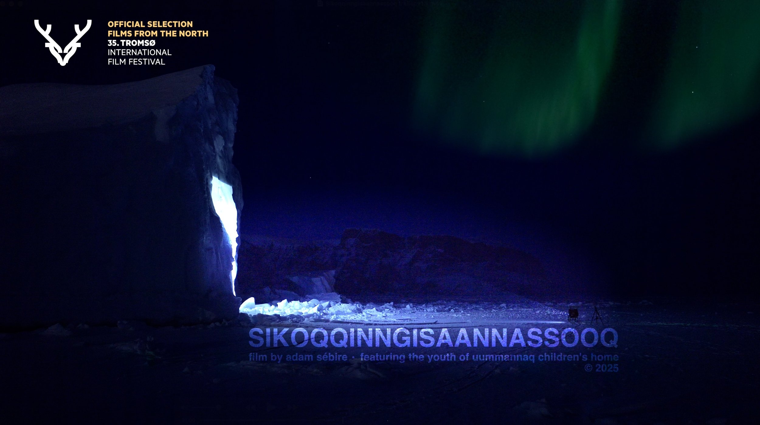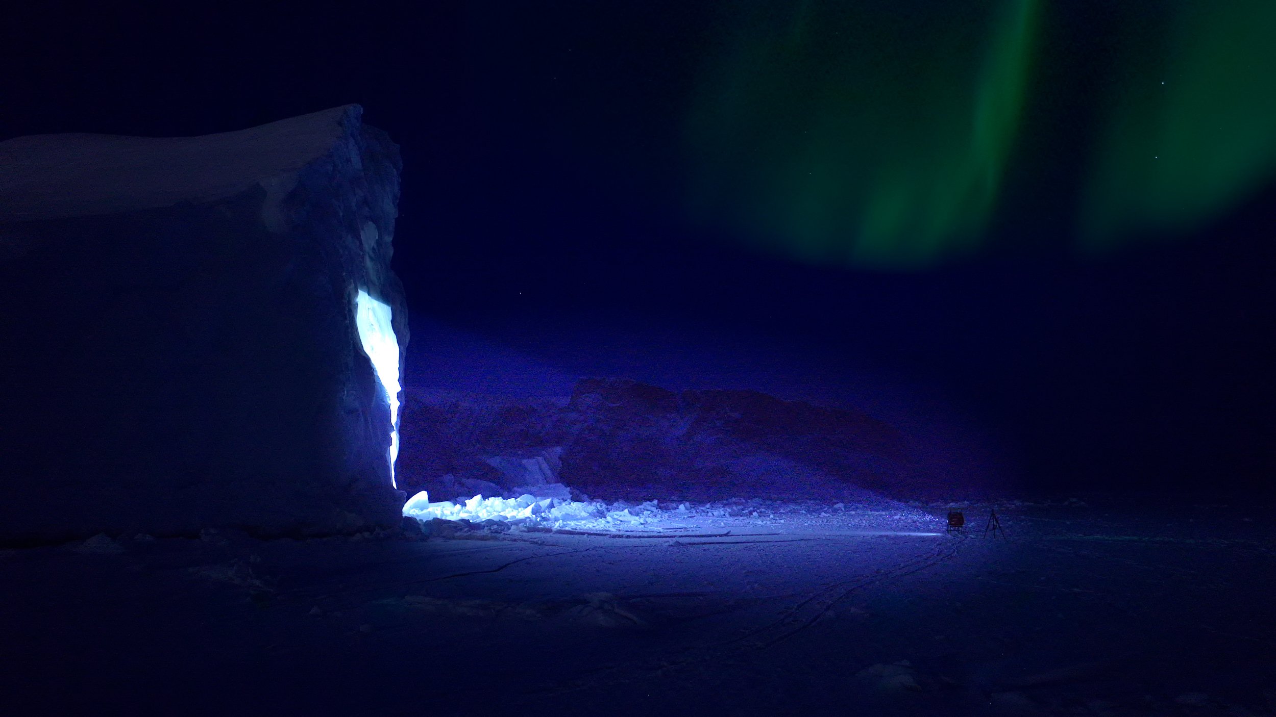 Interviews with indigenous elders (projected as a kind of ‘iceberg cinema') are punctuated with Kalaallisut words describing their disappearing winter environment. These are inscribed in the sea ice by the island's youth using hunters’ tooqs, to reflect the impacts of climate change that originate a world away.